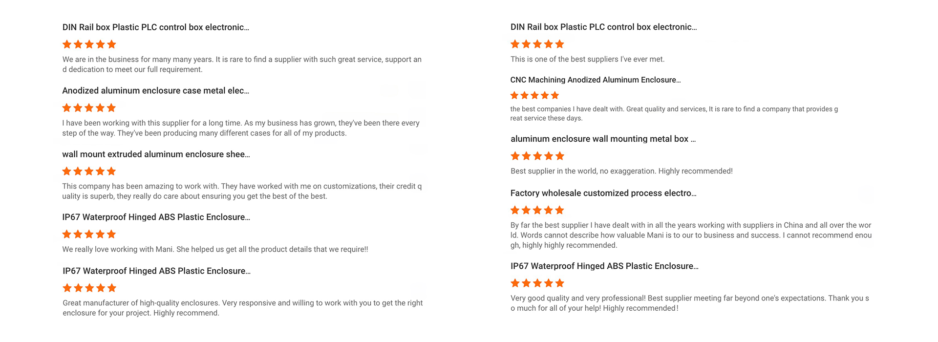 By far the best supplier I have dealt with in all the years working with suppliers in China and all over the world. Words cannot describe how valuable Mani is to our to business and success. I cannot recommend enough, highly highly recommended!